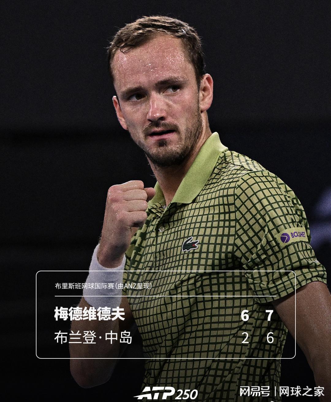 2026年1月11日,ATP250布里斯班站男单决赛落下帷幕。俄罗斯名将梅德韦杰夫直落两盘,以6-2/7-6(1)击败美国选手中岛布兰登,赢得新赛季开门红。